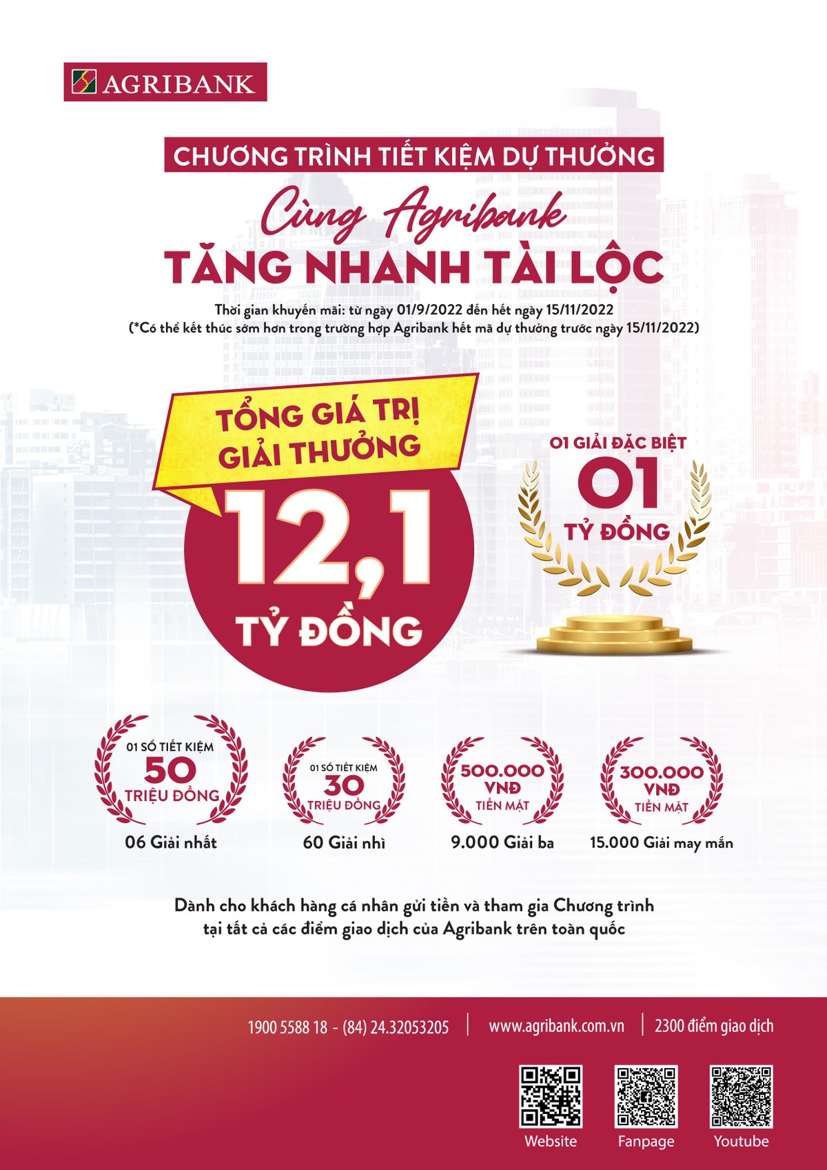 Agribank công bố kết quả trúng thưởng công khai tại tất cả các điểm giao dịch trên toàn quốc, trên website Agribank.com.vn và trên các phương tiện thông tin đại chúng và thông báo cho người trúng thưởng. Thông tin chi tiết liên hệ tại các chi nhánh và phòng giao dịch của Agribank trên toàn quốc; Hotline: 1900558818, 024 32053205; Website: www.agribank.com.vn