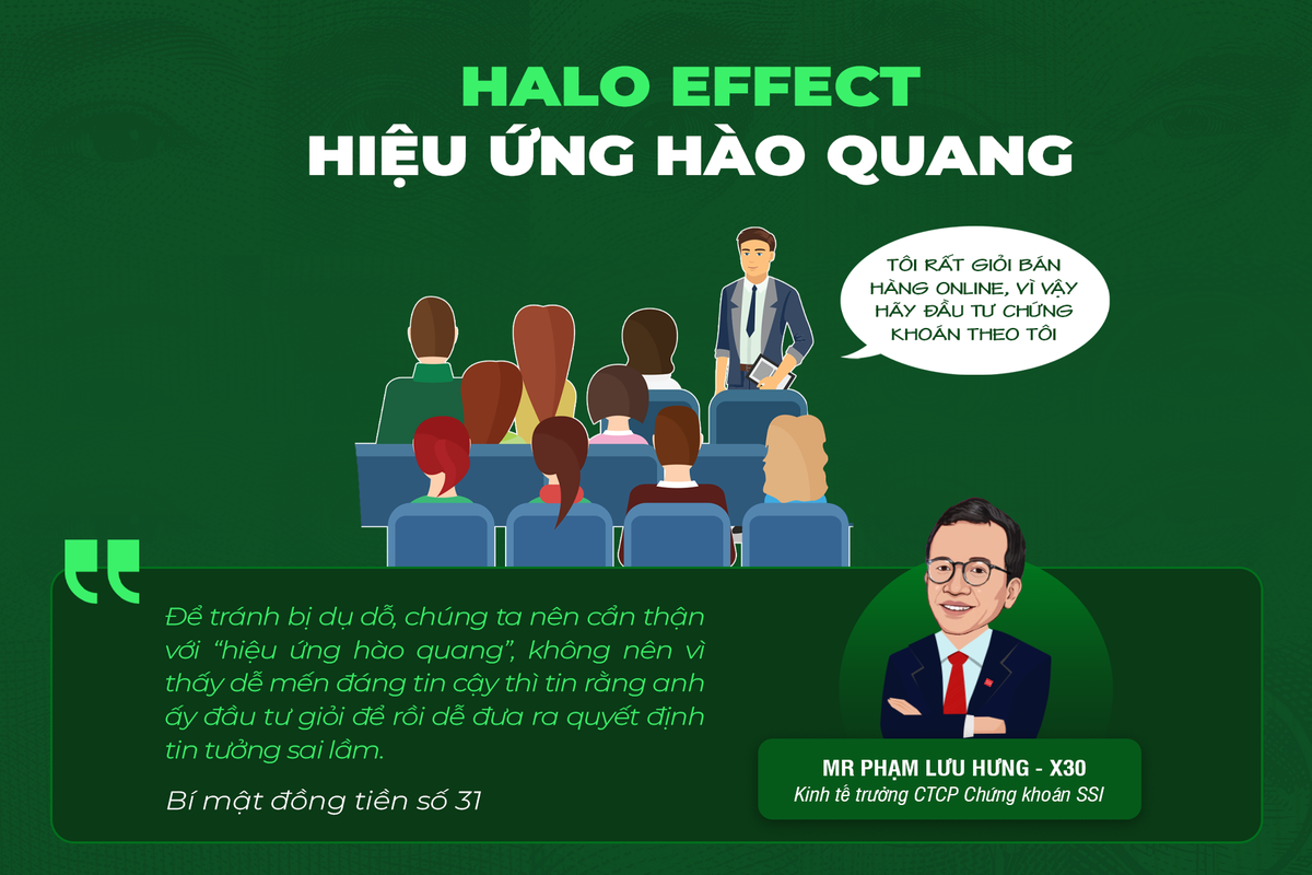 Bên cạnh câu chuyện FOMO quen thuộc, khán giả “Bí mật đồng tiền” cũng được cảnh báo nhiều “bẫy rập” khác có khả năng đe doạ đến danh mục đầu tư. Có thể ít người biết đến các hiệu ứng tâm lý Halo Effect (hào quang) hay F.U.D (sợ hãi, không chắc chắn và nghi ngờ), nhưng đây là những điều luôn hiện hữu trên thị trường.