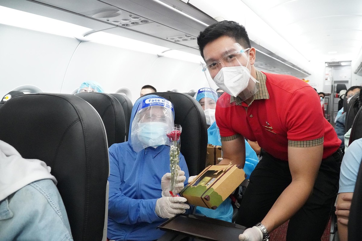 Chị Thảo Linh vui vẻ sau khi nhận được quà tặng đặc biệt từ đội tiếp viên: “Điểm 10 cho sự tâm lý của Vietjet nhé, tuy tặng hoa và quà những vẫn giữ khoảng cách an toàn và thực hiện 5K đầy đủ, vừa khiến mình an tâm vừa mang lại những điều bất ngờ thú vị, đây là bó hoa đầu tiên mình nhận được trong dịp 20/10 năm nay đấy.”.