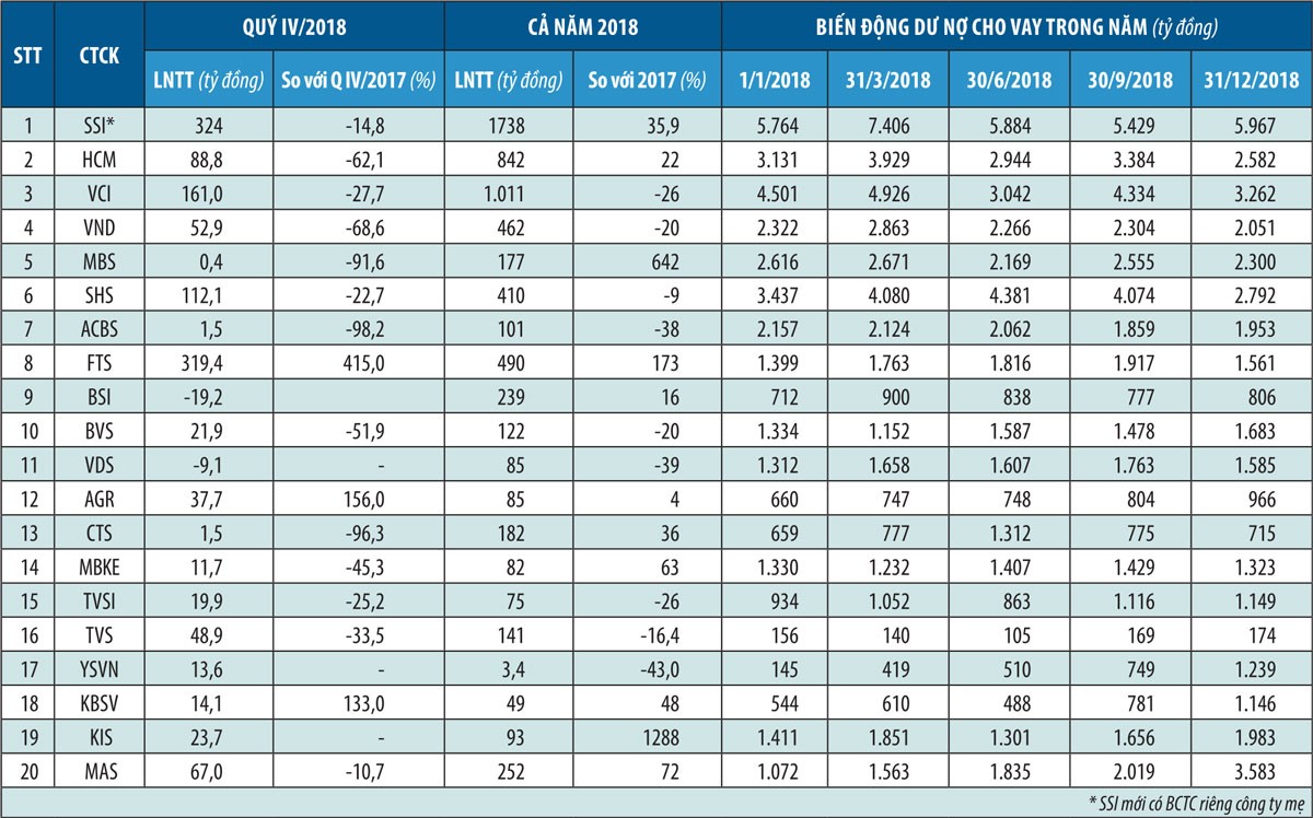 Lợi nhuận giảm không phải là câu chuyện riêng tại hai CTCK lớn SSI và HCM. Thống kê kết quả kinh doanh của 10 CTCK có thị phần giao dịch lớn nhất trên Sở Giao dịch chứng khoán TP.HCM (HOSE) trong quý IV/2018 cho thấy, có tới 9/10 công ty ghi nhận lợi nhuận sụt giảm.
