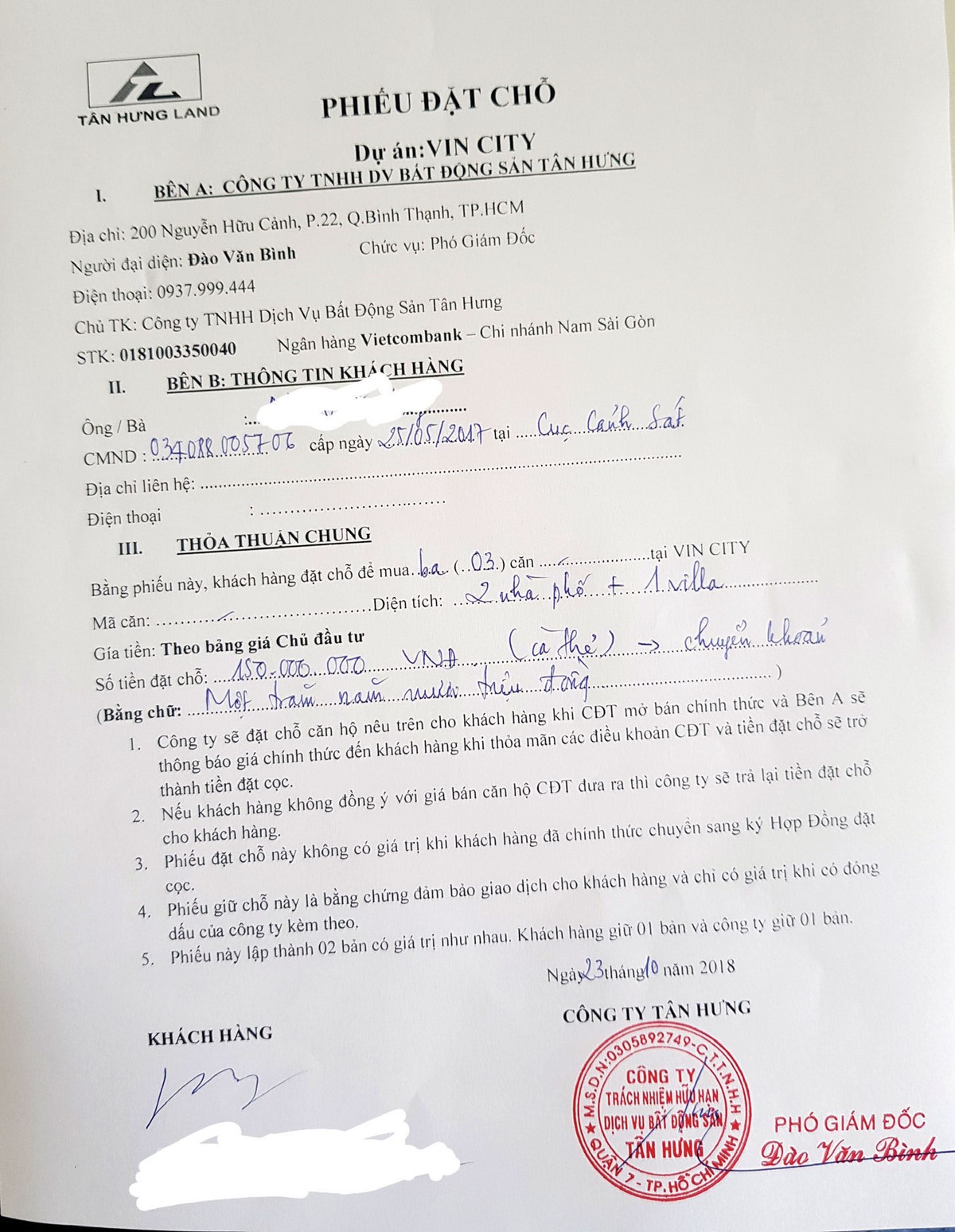 Ông Phạm Cường, một nhà đầu tư thứ cấp tại TP.HCM, sau khi xuống tiền đặt cọc mua 2 căn nhà phố, 1 căn biệt thự tại dự án Vincity cho biết, ông đợi dự án này đã rất lâu và khi các sàn bán hàng dự án này chính thức nhận đặt cọc giữ chỗ thì ông ngay lập tức xuống tiền.