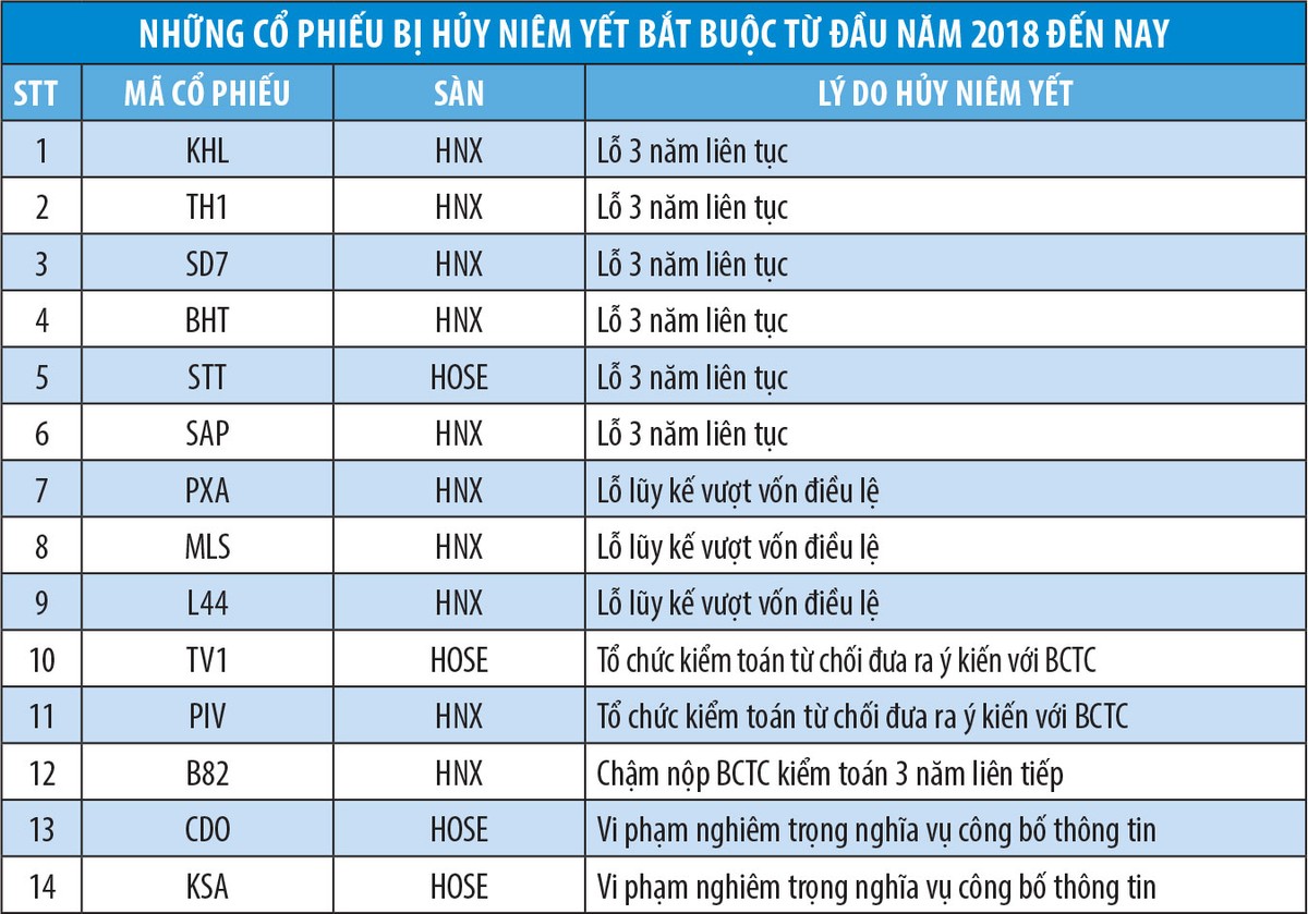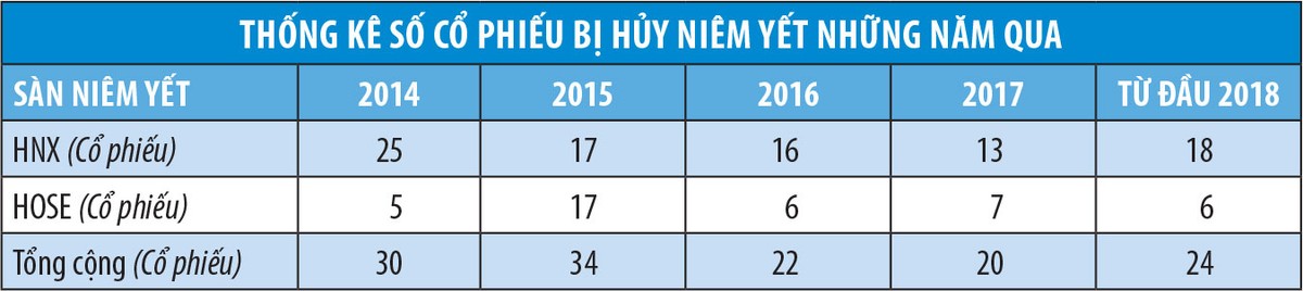 Thống kê sơ bộ cho thấy, trên hai sở giao dịch chứng khoán trong 10 tháng đầu năm 2018, có tổng cộng 14 doanh nghiệp bị hủy niêm yết bắt buộc. Nguyên nhân của việc các doanh nghiệp này bị hủy niêm yết bắt buộc khá đa dạng, nhưng đều xuất phát từ vấn đề cốt lõi là doanh nghiệp hoạt động yếu kém và kém minh bạch. Từ việc thua lỗ 3 năm liên tiếp, lỗ vượt vốn điều lệ cho tới vi phạm nghiêm trọng nghĩa vụ công bố thông tin, hay bị tổ chức kiểm toán từ chối đưa ra ý kiến với báo cáo kiểm toán...