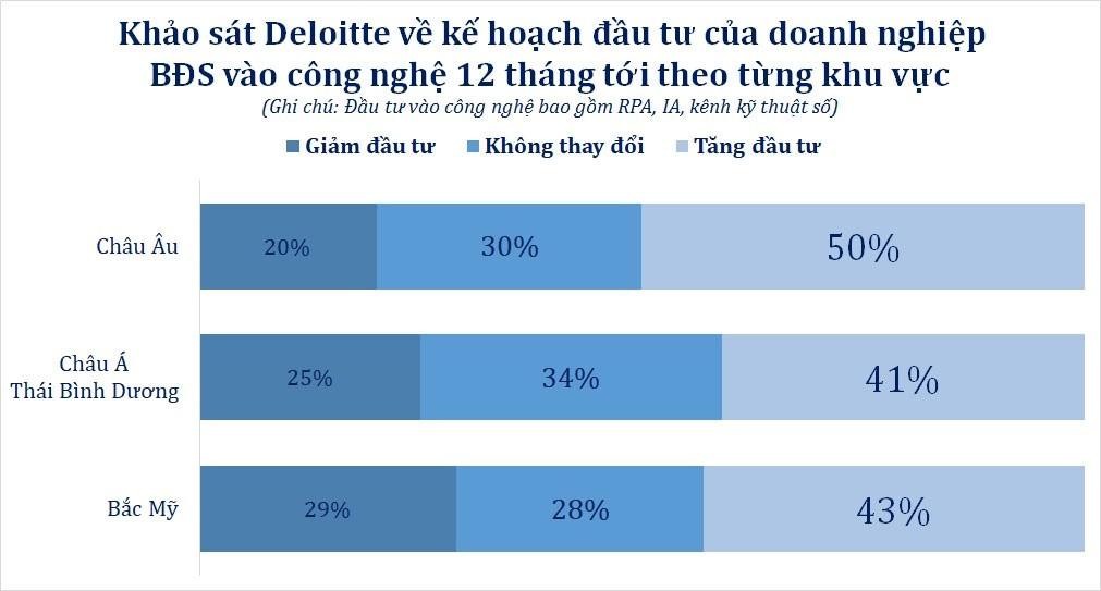 Theo báo cáo triển vọng bất động sản thương mại 2021 của Deloitte, 56% doanh nghiệp được hỏi cho biết đại dịch COVID-19 giúp họ nhận ra thiếu sót trong số hóa quy trình kinh doanh. Bởi lẽ đó, 45% doanh nghiệp có kế hoạch tăng đầu tư vào công nghệ 12 tháng tới, gồm tự động hóa quy trình bằng robot (RPA), trí tuệ nhân tạo (AI) và các kênh kỹ thuật số.