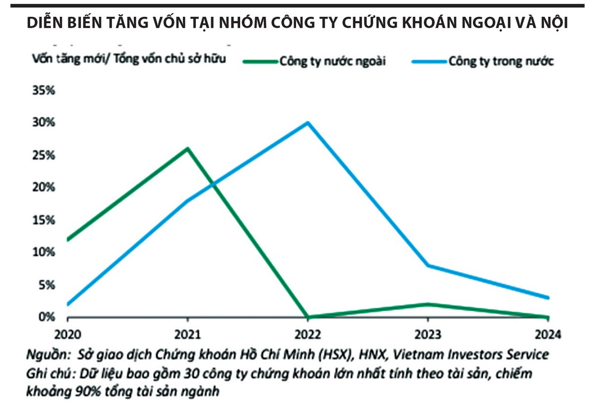Một chuyên gia tài chính cho biết, khi mới bắt đầu xâm nhập thị trường Việt Nam, các công ty chứng khoán ngoại tăng vốn rất mạnh, nhưng những năm gần đây, hoạt động tăng vốn tập trung chủ yếu tại công ty chứng khoán nội. Một phần nguyên nhân xuất phát từ việc các công ty chứng khoán ngoại sau giai đoạn 2022 bị ảnh hưởng khá nhiều bởi hoạt động cho vay margin thua lỗ và hoạt động tự doanh chậm lại. Nhóm công ty chứng khoán ngoại khi tham gia thị trường đã cạnh tranh bằng giảm phí hoặc miễn phí giao dịch, chấp nhận giảm biên lợi nhuận để cạnh tranh, trong khi các hoạt động kinh doanh khác chưa thể chiếm được thị phần lớn.