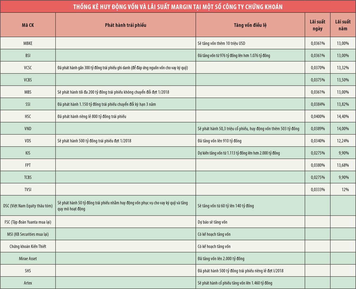 Giám đốc môi giới tại một công ty chứng khoán cho biết, tính trung bình, lãi suất cho vay margin khoảng 12%/năm. Nhiều công ty đã và đang tăng cường huy động vốn. Hoạt động tăng vốn của các công ty chứng khoán chủ yếu để bổ sung vốn kinh doanh, tập trung cho hoạt động cung cấp dịch vụ tài chính, hoặc đáp ứng điều kiện tham gia thị trường phái sinh hay phát hành chứng quyền có bảo đảm.