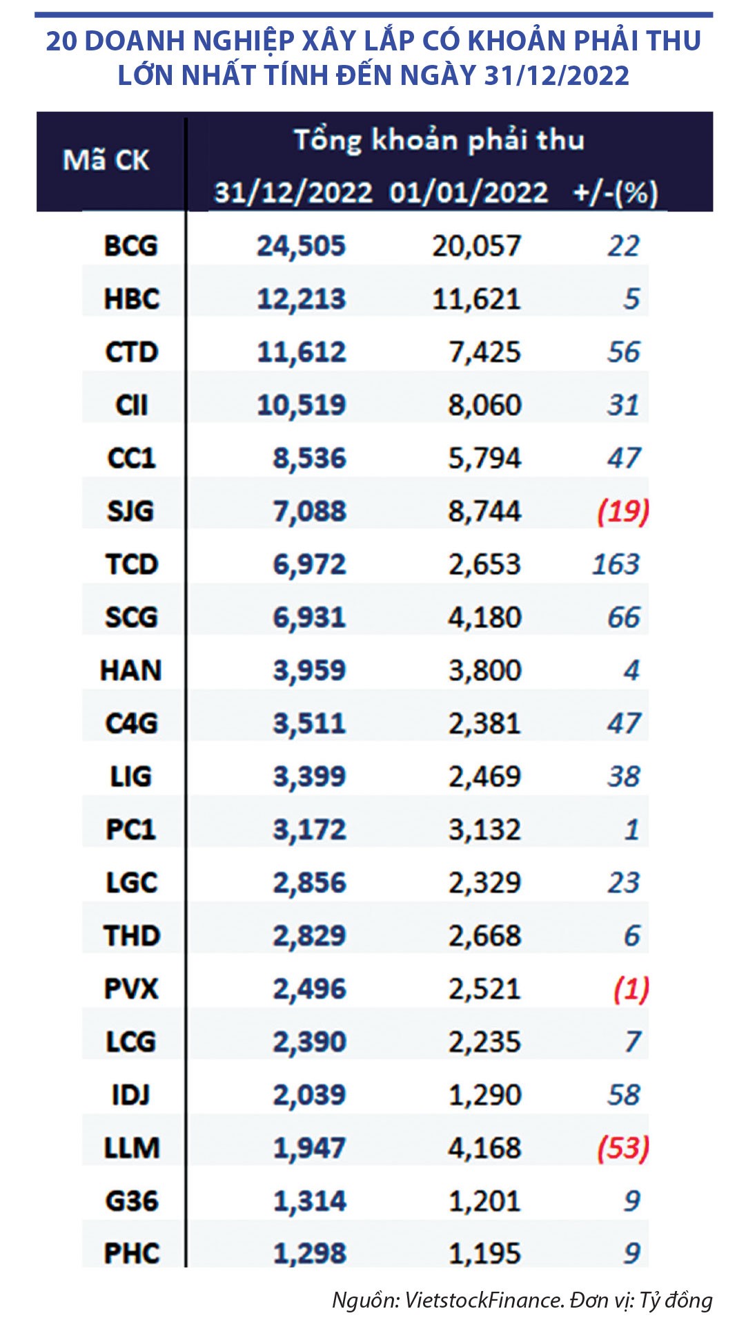 Đáng chú ý, tổng các khoản phải thu của 98 doanh nghiệp xây dựng này tại thời điểm 31/12/2022 đạt hơn 148.000 tỷ đồng, tăng hơn 16% so với hồi đầu năm. Tổng dự phòng nợ khó đòi cũng tăng 36%, vượt mức 9.000 tỷ đồng. Điều này cho thấy các doanh nghiệp trong ngành tiếp tục đối mặt với tình trạng khó thu hồi nợ từ chủ đầu tư.