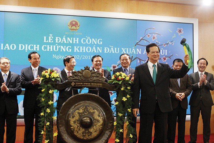 Thủ tướng Chính phủ gõ cồng khai trương phiên giao dịch chứng khoán đầu năm Ất Mùi 2015 tại Sở GDCK Hà Nội