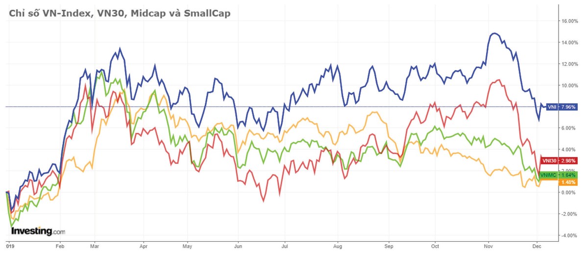 Sau nhiều tháng dao động tích lũy, chỉ số VN-Index đã vượt ngưỡng 1.000 điểm từ đầu tháng 11/2019, nhưng chỉ duy trì được vài phiên rồi có xu hướng giảm mạnh, hiện dao động quanh mốc 960 điểm.