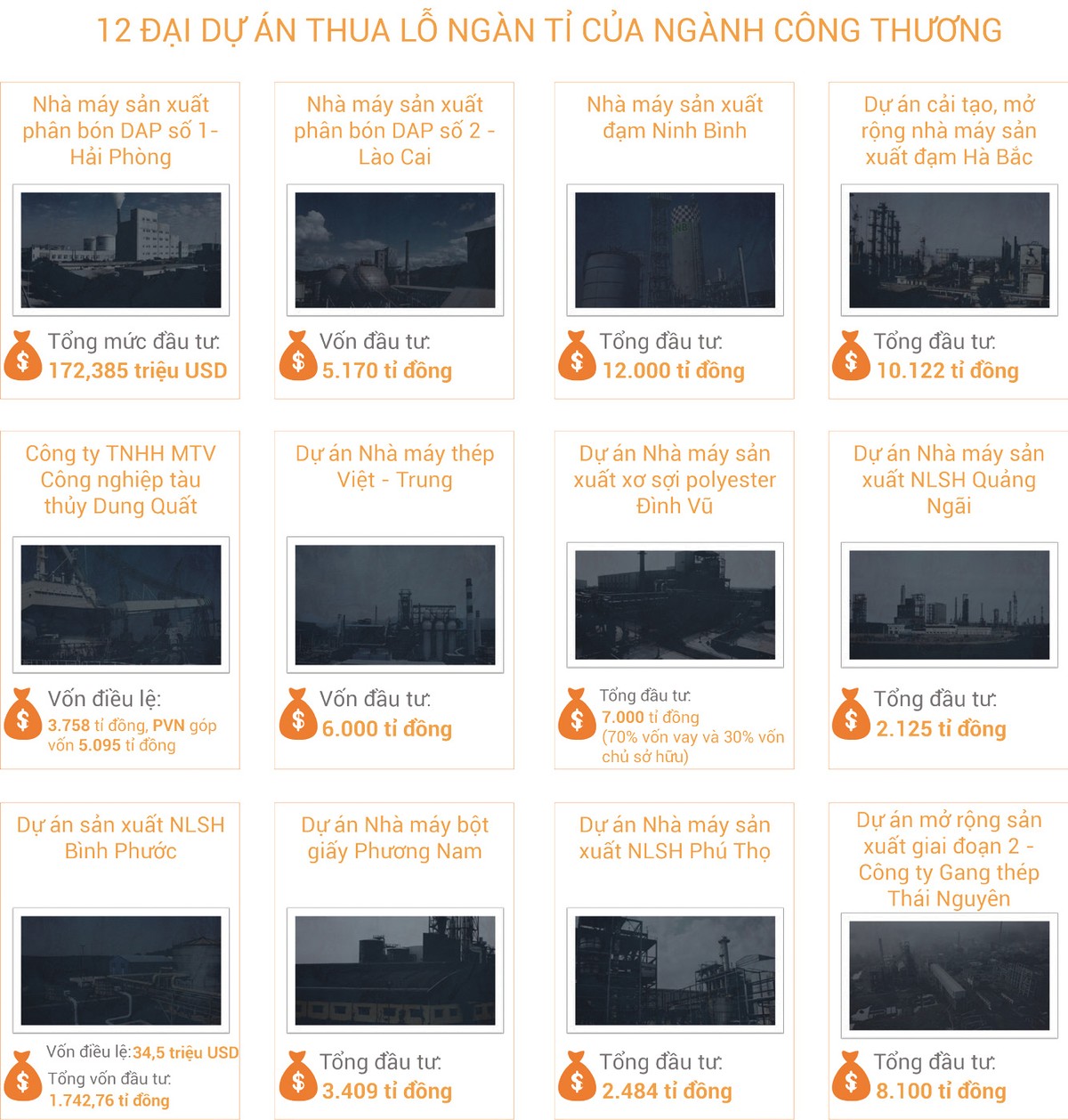 Dư luận vẫn không ngớt lo ngại về những khó khăn, bế tắc của 12 dự án thua lỗ ngành công thương. Những dự án này đã và đang gây thất thoát hàng nghìn tỷ đồng vốn nhà nước, để lại hậu quả kéo dài. Có dự án trong số này đã mấp mé bờ vực phá sản, tồn tại lay lắt. Đáng lo ngại hơn là sự phá sản này có thể kéo sập cả tập đoàn chủ quản, gây thiệt hại lớn cho khu vực DNNN cũng như toàn bộ nền kinh tế, như trường hợp Nhà máy Đạm Ninh Bình thuộc Tập đoàn Hóa chất Việt Nam.