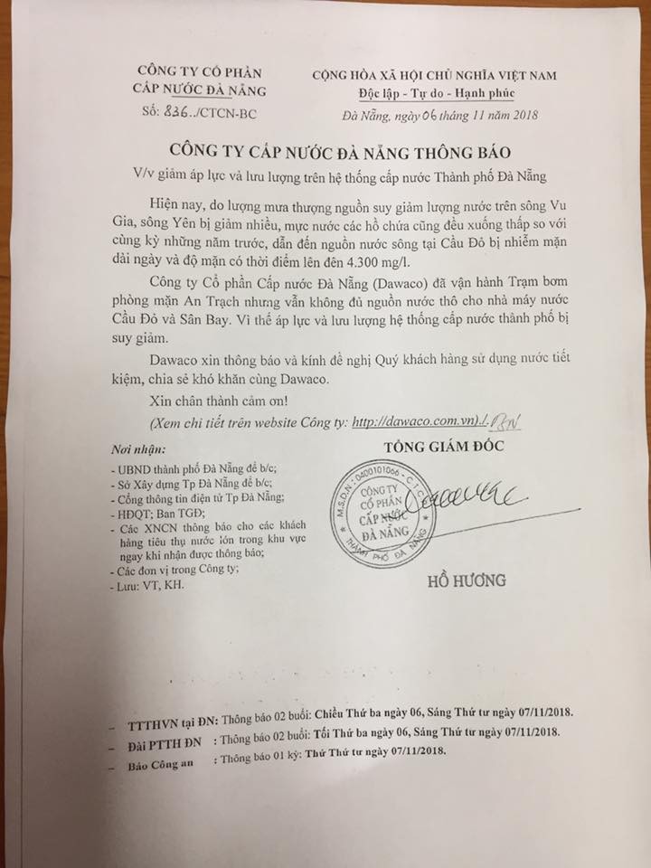 Dawaco thông báo giải thích nguyên nhân thiếu nước sinh hoạt trên địa bàn thành phố Đà Nẵng.