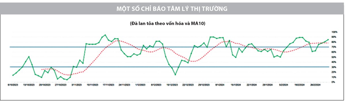 Bên cạnh đó, sự trở lại mạnh mẽ của thị trường còn được ghi nhận trên chỉ báo định lượng, khi đường đà lan tỏa ngắn hạn tăng trở lại và vượt lên trên đường MA10 của chính nó. Điều này được ghi nhận rất rõ khi nhóm vốn hóa lớn và ngân hàng đóng vai trò dẫn dắt trong các phiên giao dịch đầu tuần. Dù có sự chậm lại, điều chỉnh trong phiên cuối tuần, nhưng sự vận động của nhóm chỉ là điều chỉnh với khối lượng nhỏ. Do đó, việc điều chỉnh của nhóm cổ phiếu ngân hàng vẫn đang được đánh giá là lành mạnh. Mặt khác, nhóm này đã làm rất tốt vai trò dẫn dắt chỉ số về đỉnh ngắn hạn cũ trong suốt nhịp tăng 3 tháng vừa qua và có lẽ cũng cần đến lúc tạm nghỉ ngơi.