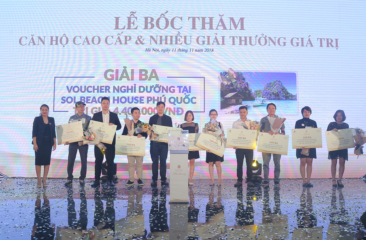 Tuy nhiên, phần được khách hàng tham dự mong chờ nhất chính là phần bốc thăm may mắn. Khách hàng Bùi Quốc Cường (55 tuổi ở Minh Khai, Hà Nội) cho biết: “Chưa bao giờ tôi tham dự sự kiện nào lại có nhiều giải thưởng giá trị như sự kiện này. Có tới 20 giải 3 là 20 chuyến du lịch Phú Quốc, 02 giải nhì là chuyến du lịch Singapore và Malaysia, 02 giải nhất là chuyến du lịch Châu Âu. Và đặc biệt thì có giá trị quá lớn. 1 căn hộ lên tới 2,245 tỷ đồng”.