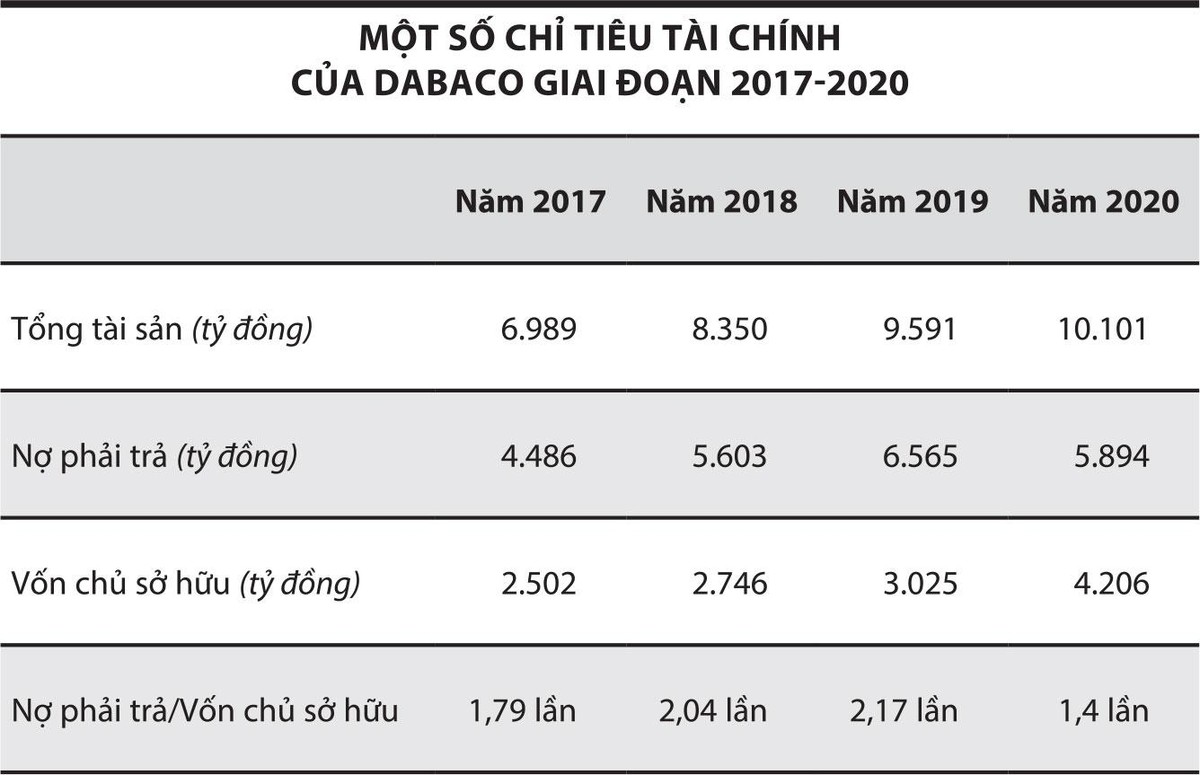 Tuy nhiên, có một vấn đề đáng quan tâm ở tập đoàn này là nợ vay đang khá lớn. Tại báo cáo tài chính hợp nhất năm 2020, nợ phải trả của Dabaco ghi nhận 5.894 tỷ đồng, chiếm 58,3% trong cơ cấu tổng tài sản và gấp 1,4 lần vốn chủ sở hữu. Trong đó, nợ vay ngắn hạn chiếm 72,1% các khoản nợ vay.