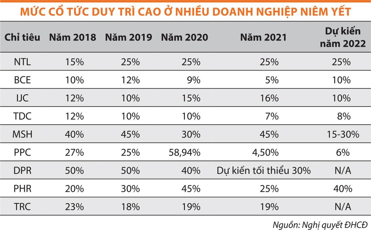 Từ năm 2019 tới năm 2021, doanh nghiệp này đều đặn trả cổ tức bằng tiền mặt ở tỷ lệ 25%, năm 2022 dự kiến tiếp tục duy trì tỷ lệ này. Với mức giá đóng cửa tại ngày 16/5/2022 là 24.900 đồng/cổ phiếu, tính ra lợi tức của cổ phiếu NTL là 10%/năm, cao hơn nhiều so với lãi suất tiền gửi ngân hàng.