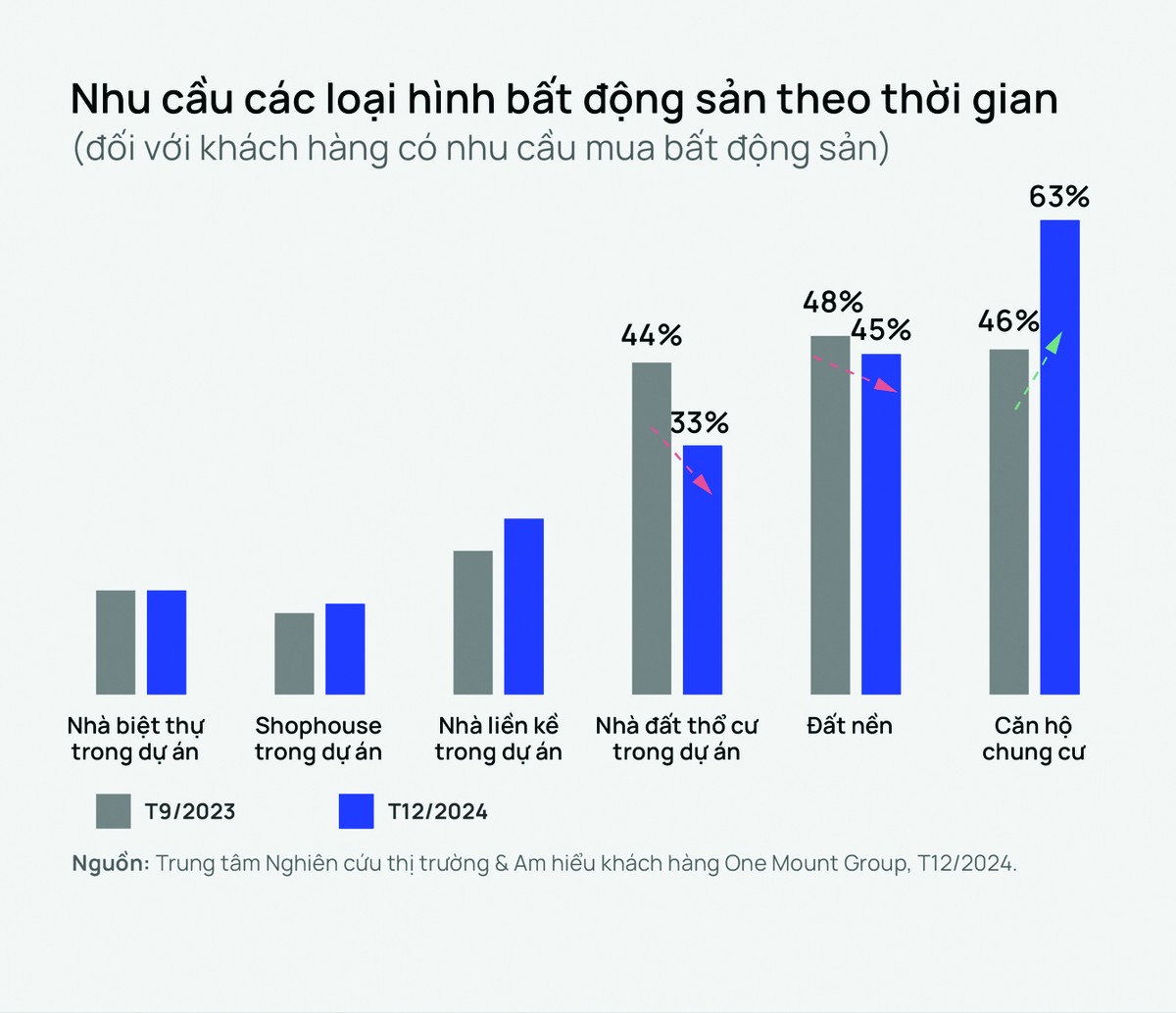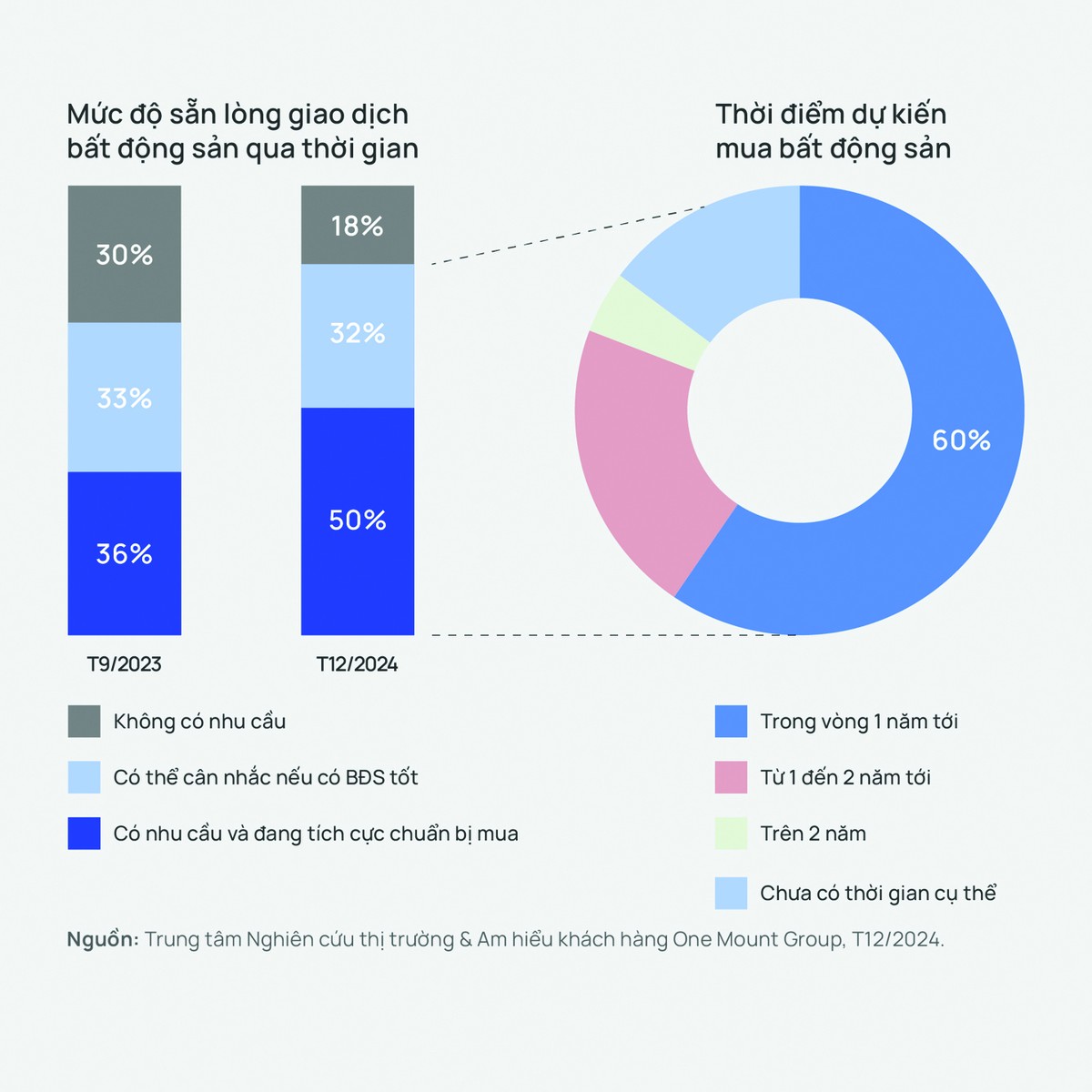 Báo cáo khảo sát của Trung tâm Nghiên cứu Thị trường và Am hiểu Khách hàng One Mount Group công bố đầu tháng 3/2025 cho thấy, số người có kế hoạch mua nhà trong năm 2025-2026 tăng 15%, trong đó 50% khách hàng đang tích cực chuẩn bị giao dịch. Xu hướng lạc quan này càng được củng cố khi có đến 60% khách hàng dự kiến sẽ mua bất động sản trong vòng một năm tới.