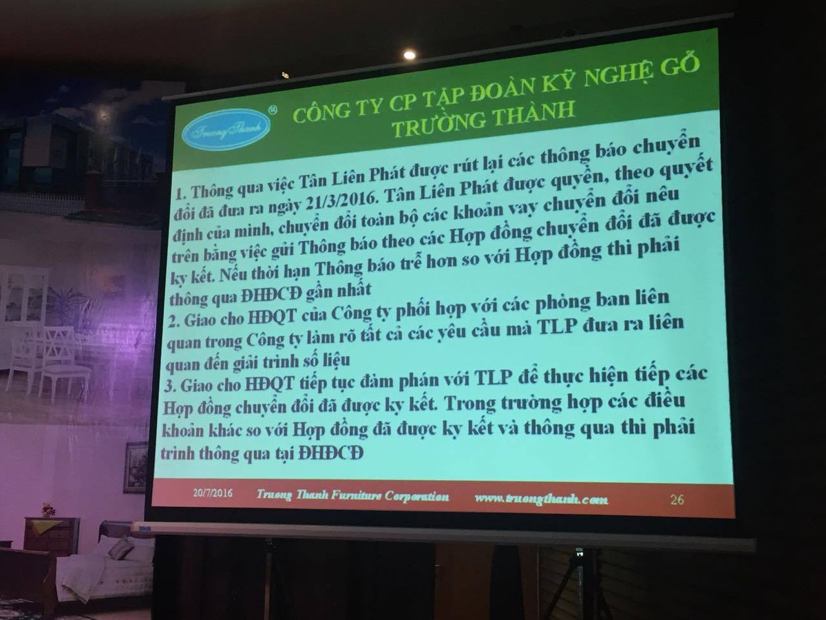Để có thời gian làm việc và làm rõ tình trạng nêu trên, ông Võ Trường Thành trình Đại hội đồng cổ đông thông qua các nội dung gồm: thông qua Tân Liên Phát được rút lại các Thông báo chuyển đổi đã đưa ra ngày 21/3/2016; Tân Liên Phát được toàn quyền, theo quyết định của mình, chuyển đổi toàn bộ các khoản vay chuyển đổi nêu trên bằng việc gửi Thông báo chuyển đổi vào bất kỳ thời điểm nào sau khi Nghị quyết ĐHCĐ bất thường được thông qua.