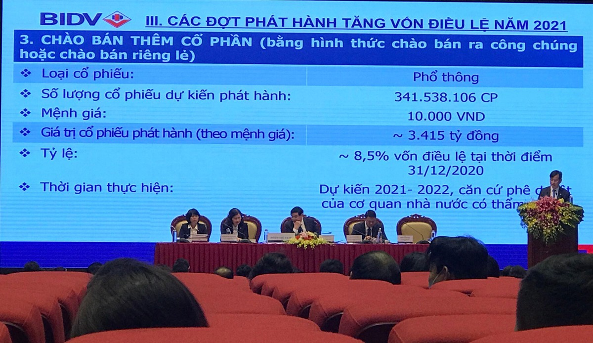 Bên cạnh đó, BIDV lên kế hoạch phát hành thêm 341,5 triệu cổ phần mới bằng hình thức chào bán ra công chúng hoặc chào bán riêng lẻ, tương đương 8,5% vốn điều lệ tại thời điểm 31/12/2020. Thời gian dự kiến trong giai đoạn 2021 - 2022 căn cứ phê duyệt của cơ quan nhà nước có thẩm quyền.