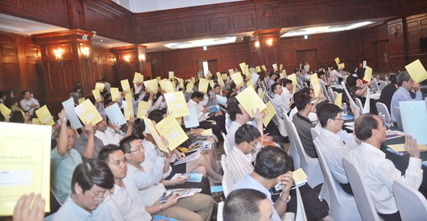 8h30: ĐHCĐ bắt đầu khai mạc với phần giới thiệu thành phần tham dự và Ban kiểm tra tư cách cổ đông. Báo cáo kết quả kiểm tra tư cách cổ đông tham dự Đại hội của ông, Bùi Minh Khải, Trưởng Ban kiểm tra tư cách cổ đông.