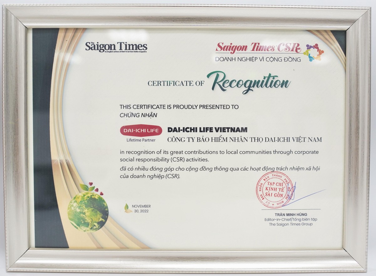 Đây là năm thứ tư liên tiếp (2019-2022) Dai-ichi Life Việt Nam được trao tặng danh hiệu cao quý này, một lần nữa ghi nhận và tôn vinh những đóng góp ý nghĩa cho cộng đồng của Công ty thông qua các hoạt động trách nhiệm xã hội của doanh nghiệp (CSR) nhằm mang đến những giá trị bền vững cho cộng đồng, xã hội và tác động tích cực cho môi trường, hướng đến một cuộc sống tốt đẹp hơn cho người dân Việt Nam.