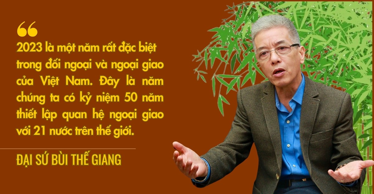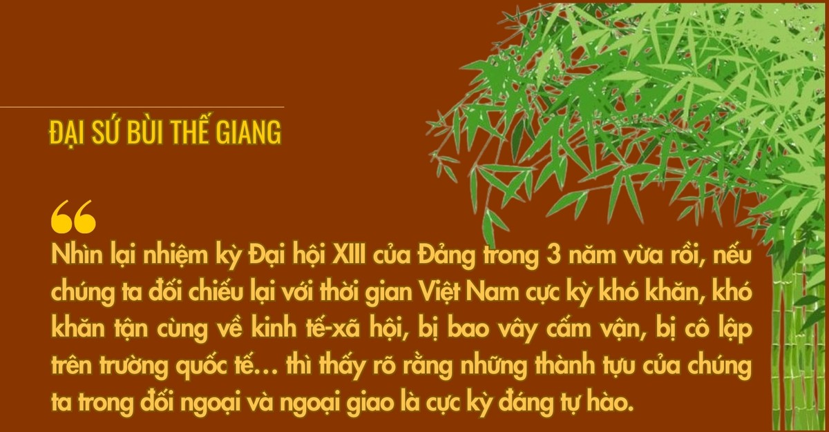 Nói về những dấu ấn, thành tựu nổi bật của đối ngoại và ngoại giao của Việt Nam trong năm 2023 và 3 năm đầu nhiệm kỳ Đại hội XIII của Đảng, Đại sứ Bùi Thế Giang bày tỏ sự tán thành với những dấu ấn, thành tựu đã được Bộ trưởng Bộ Ngoại giao Bùi Thanh Sơn và Tổng Bí thư Nguyễn Phú Trọng tổng kết. Và cá nhân ông cũng có những nhấn mạnh riêng.