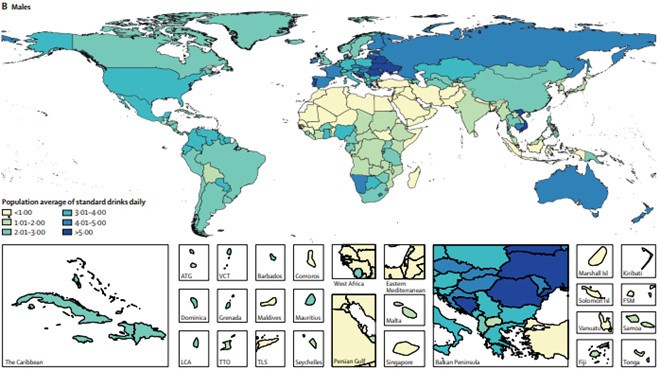 Cụ thể, theo nghiên cứu của The Lancet, Việt Nam có mức tiêu thụ đồ uống có cồn trung bình của mỗi nam giới lên tới 5 đơn vị cồn (khoảng 4 cốc bia) một ngày, mức cao nhất trong thang đánh giá của nghiên cứu.