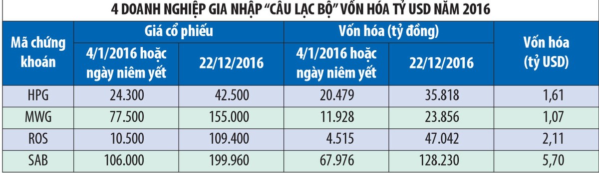 Mỗi doanh nghiệp lọt vào danh sách vốn hóa tỷ USD trong năm 2016 (chưa tính các doanh nghiệp trên sàn UPCoM) đều mang trong mình câu chuyện riêng, có tên tuổi đã được khẳng định trong ngành, qua thời gian dài tạo niềm tin với nhà đầu tư, nhưng cũng có cái tên khá mới, nhưng đều đem lại niềm vui cho cổ đông, nhà đầu tư “can đảm” đặt niềm tin vào doanh nghiệp.