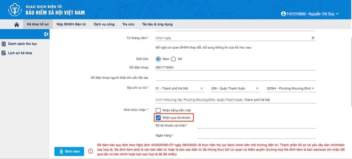 Bước 4: Kê khai vào các trường thông tin có sẵn, sau đó lựa chọn nhận qua tài khoản và điền thông tin về số tài khoản nhận chế độ, mã xác nhận rồi chọn “xác nhận”.