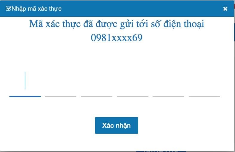 Bước 5: Khi xác nhận đã điền đủ thông tin, hệ thống sẽ gửi mã xác thực (OTP) gồm 6 chữ số về số điện thoại đã đăng ký. Tiếp tục nhập mã số OTP và chọn “xác nhận” để hoàn tất thủ tục đăng ký. Nếu thành công, hệ thống sẽ thông báo thủ tục đã hoàn tất.