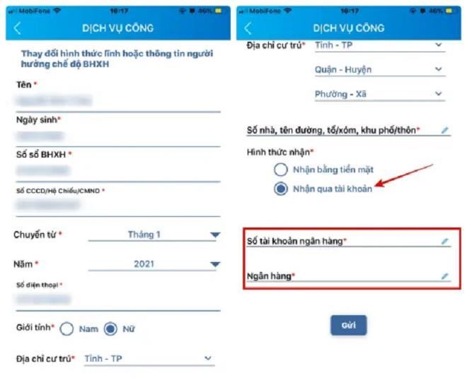Bước 3: Nhập thông tin bắt buộc (có dấu sao đỏ), Tại mục Hình thức nhận 🡪 chọn nhận qua tài khoản. Nhập số tài khoản ngân hàng và tên Ngân hàng (ghi rõ tên chi nhánh ngân hàng) mà người hưởng muốn nhận 🡪bấm Gửi.