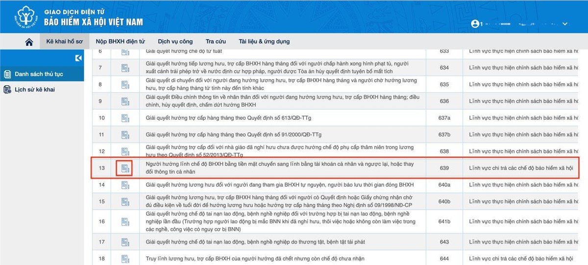 Bước 3: Tìm và chọn tên dịch vụ công “Người hưởng lĩnh chế độ BHXH bằng tiền mặt chuyển sang lĩnh bằng tài khoản cá nhân và ngược lại, hoặc thay đổi thông tin cá nhân”, sau đó click vào hình ảnh tờ khai bên cạnh để kê khai thông tin.