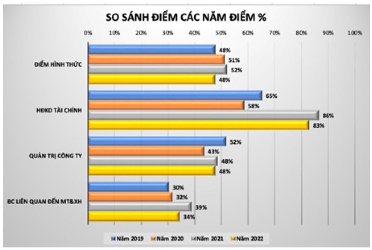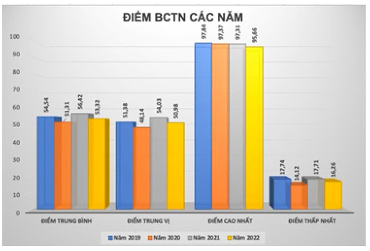 Mặc dù có sự giảm điểm nhẹ ở điểm trung bình và trung vị, nhưng nếu xét đến những thay đổi trong cấu trúc thang điểm nêu trên thì thấy rằng, điểm cao nhất và điểm thấp nhất của năm 2022 là tương đương năm 2021. Trong bối cảnh gia tăng đáng kể số lượng doanh nghiệp được đưa vào đánh giá (tăng 11%), có thể nói năm 2022 ghi nhận nỗ lực cải thiện soạn thảo và công bố BCTN của các doanh nghiệp niêm yết.