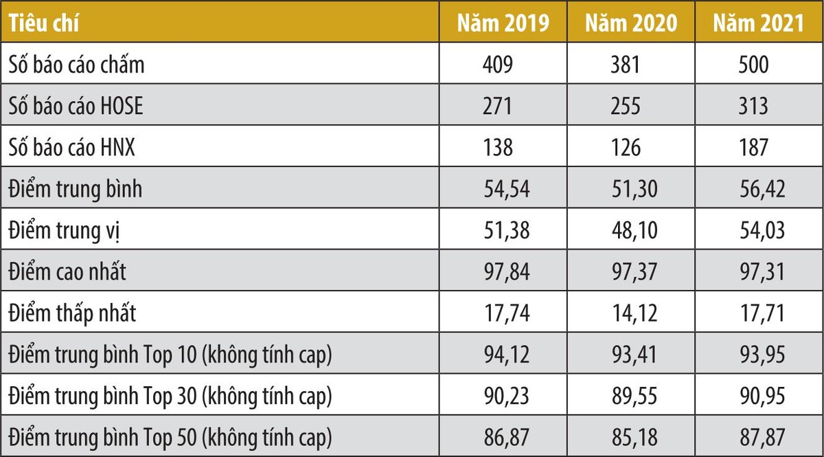 Điểm số năm 2021 đã có mức tăng khá so với năm 2020, điểm trung bình và trung vị đã cao hơn mức điểm năm 2019 - là năm chưa bị ảnh hưởng của dịch Covid. Có thể thấy, doanh nghiệp đã có sự thích ứng trong năm 2021 và cải thiện công tác soạn thảo báo cáo thường niên.