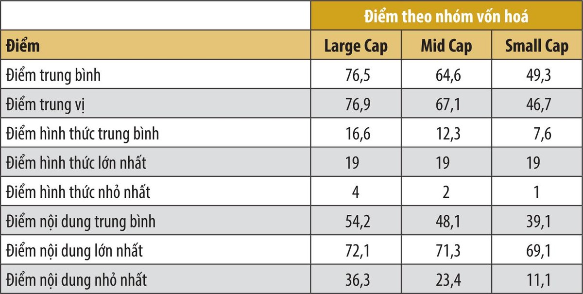 Đi đầu về điểm số ở cả nội dung lẫn hình thức vẫn là nhóm vốn hóa lớn với điểm trung bình chung và điểm trung bình các phần cao hơn hai nhóm còn lại. So sánh điểm số các nhóm doanh nghiệp có thể thấy, các doanh nghiệp tốt nhất ở ba nhóm vốn hoá đều đầu tư tốt cho phần hình thức và đạt điểm cao ngang nhau. Tuy vậy, ở phần nội dung thì doanh nghiệp nhóm vốn hoá lớn vẫn có sự đầu tư khá hơn các doanh nghiệp ở các nhóm quy mô trung bình và nhỏ.