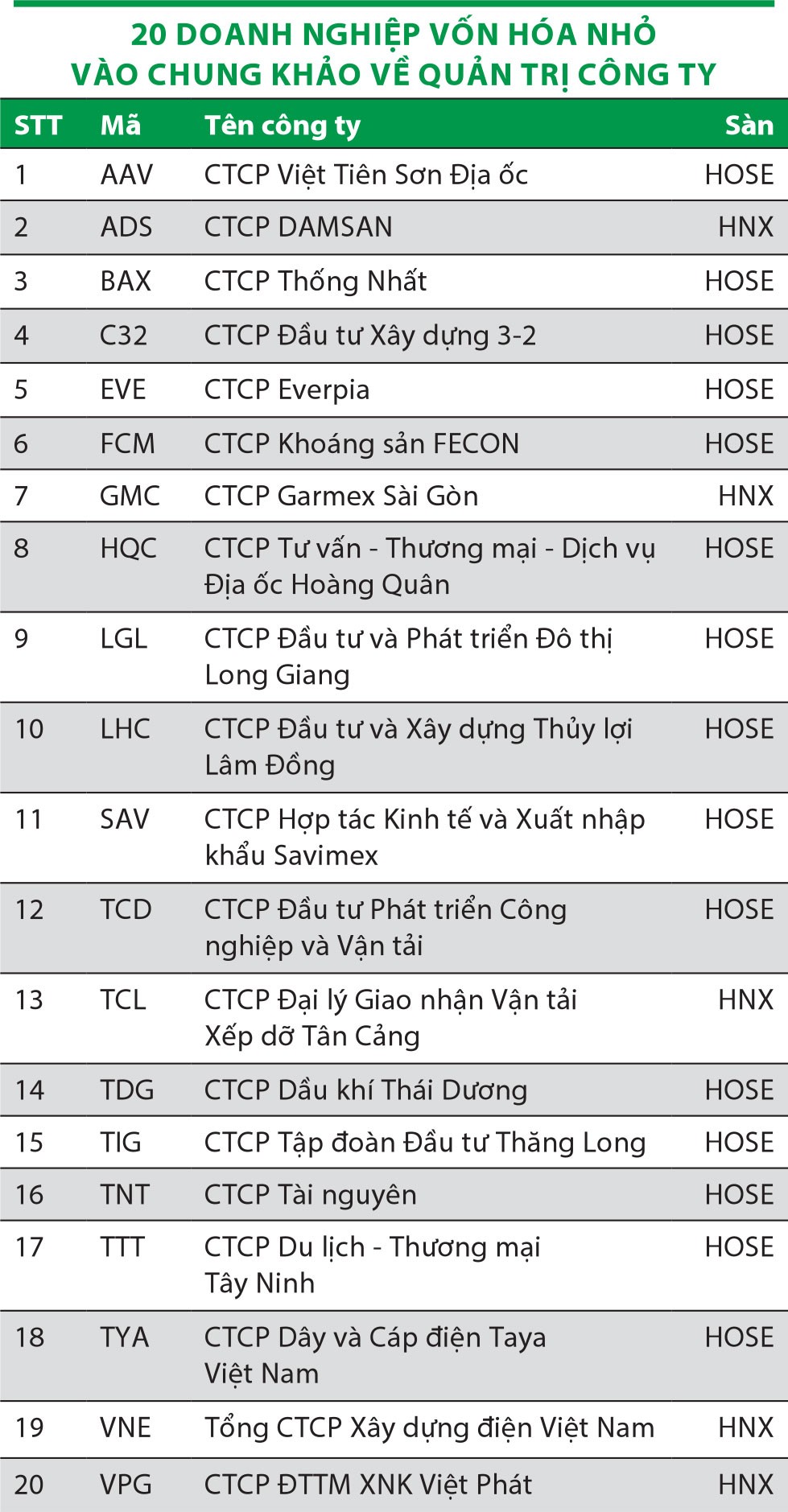 Ở hạng mục báo cáo quản trị công ty, 60 doanh nghiệp có nội dung báo cáo quản trị công ty tốt nhất được chọn vào vòng chung khảo, phân theo từng nhóm vốn hóa, mỗi nhóm 20 doanh nghiệp (xem bảng).