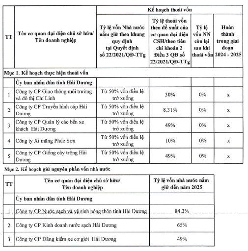 - Phụ lục III về Kế hoạch thực hiện thoái vốn, giữ nguyên phần vốn nhà nước đến hết năm 2025 (Danh mục doanh nghiệp nhà nước, doanh nghiệp có vốn nhà nước thực hiện thoái vốn, giữ nguyên phần vốn nhà nước đến hết năm 2025).