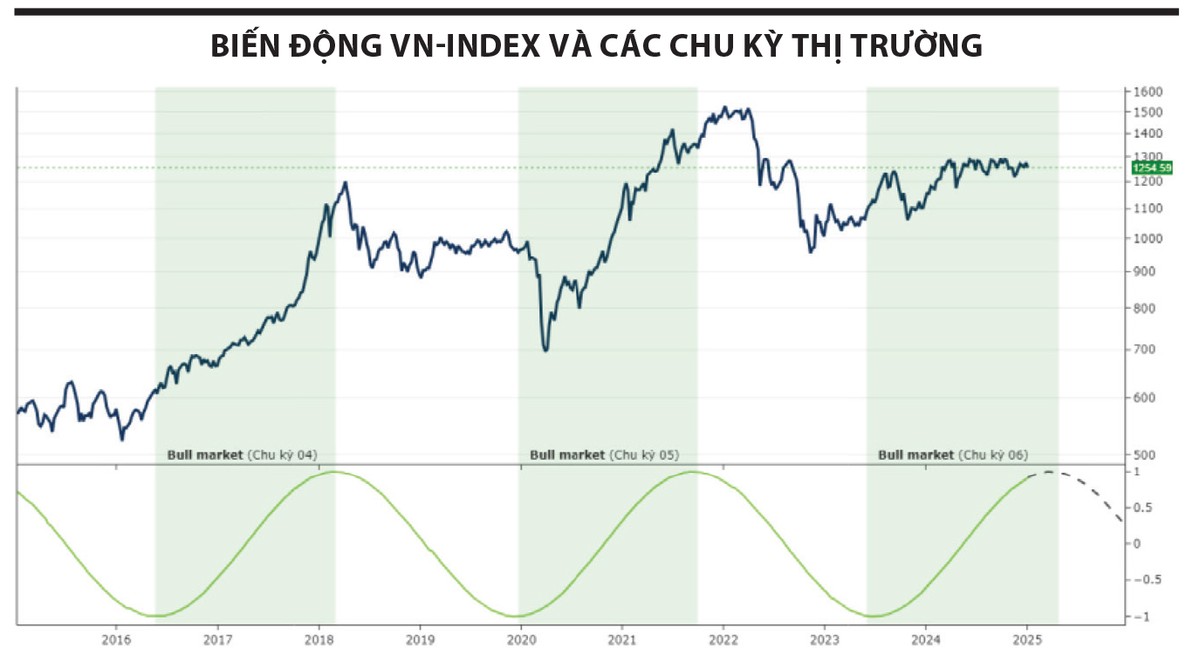 Dựa trên quy luật chu kỳ và hệ thống tín hiệu, chúng tôi nhận thấy, thị trường Bear Market có nguy cơ xuất hiện và chi phối biến động chủ đạo của thị trường chứng khoán năm 2025. Tuy nhiên, trạng thái biến động chính của VN-Index được dự kiến hình thành dưới dạng Choppy Market, với những đặc điểm sau: chỉ số dao động trong một kênh giá rộng, hình thành kênh xu hướng đi ngang; biên độ dao động lớn, từ 15 - 19%; tâm lý thị trường thận trọng, dòng tiền luân chuyển nhanh giữa các nhóm ngành; thanh khoản biến động không ổn định, các nhịp tăng mạnh xuất hiện trong ngắn hạn.