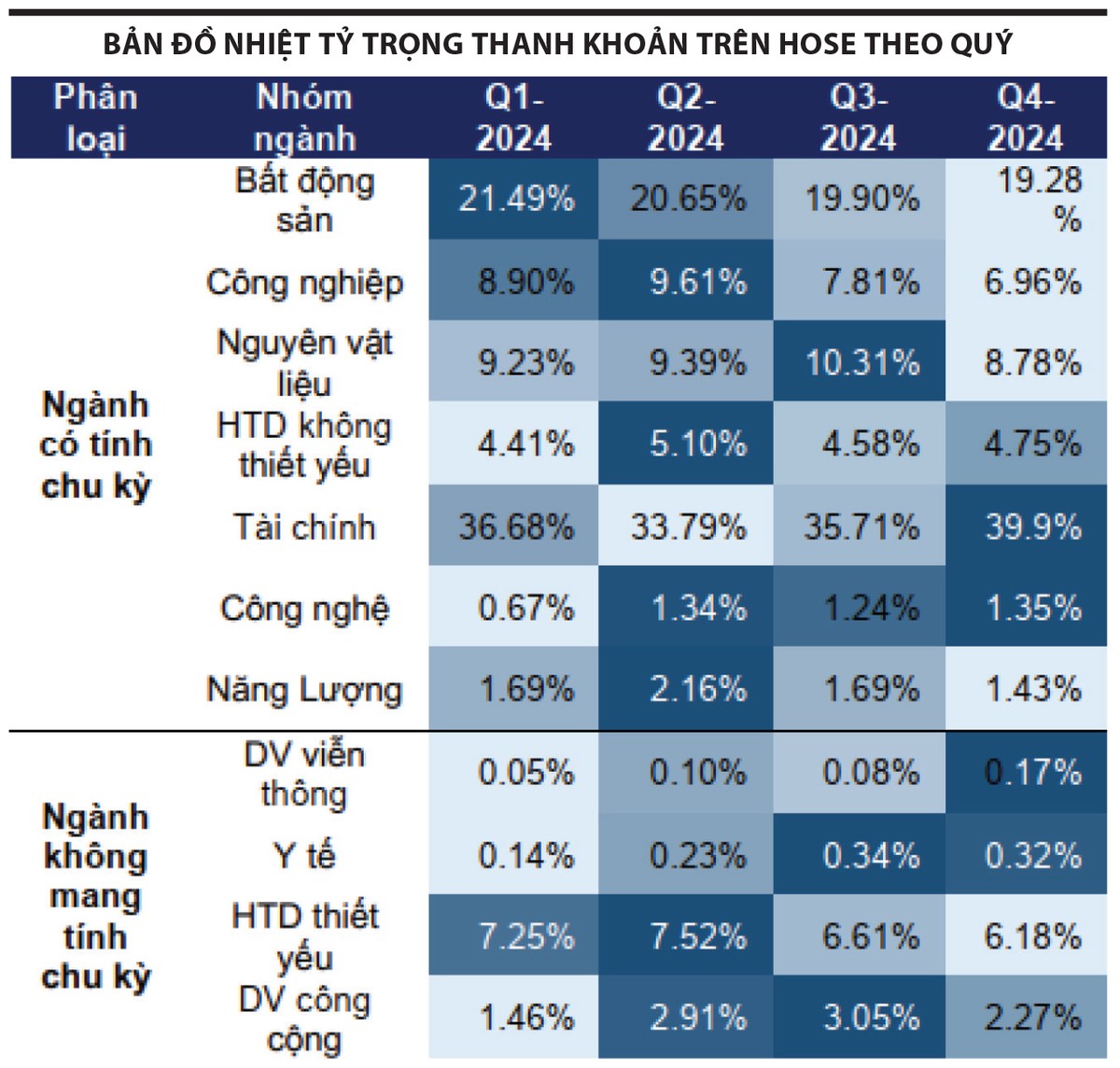 Bản đồ nhiệt về tỷ trọng thanh khoản theo ngành cho thấy khẩu vị giao dịch trên thị trường có sự chuyển dịch trong giai đoạn nửa sau của năm 2024. Các nhóm ngành có tính dẫn dắt trở nên kém hấp dẫn hơn đối với các nhà đầu tư. Dòng tiền giao dịch có khuynh hướng tập trung vào các nhóm ngành không mang tính chu kỳ và nhóm ngành có câu chuyện hỗ trợ riêng như công nghệ, tài chính, hoặc một số ít nhóm ngành cấp 3 như dệt may, dịch vụ cảng biển, dịch vụ sân bay và hỗ trợ vận tải.