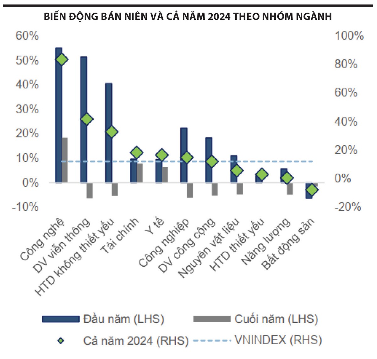 Với bối cảnh thị trường Middle Bull Market (giai đoạn giữa của pha tăng giá), luân chuyển sức mạnh giá giữa các ngành trong năm 2024 diễn ra khá tích cực, khi có 10/11 nhóm ngành ghi nhận mức hiệu suất dương. Nhóm duy nhất ghi nhận hiệu suất âm là bất động sản, mức giảm 7,7% của nhóm ngành có giá trị vốn hóa lớn này đã kìm hãm chỉ số chung.