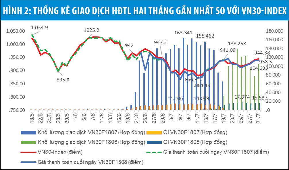 Giá giao dịch hợp đồng tương lai biến động theo sát chỉ số thị trường cơ sở. Cụ thể với trường hợp mã hợp đồng tương lai đáo hạn vào tháng 6/2018, tại thời điểm niêm yết trong tháng 10/2017 và đầu năm 2018, khi kỳ vọng đối với thị trường cơ sở tăng, hợp đồng được giao dịch với giá cao hơn chỉ số VN30 Index. Tuy nhiên, khi còn 1 tháng đến thời điểm đáo hạn, giá của hợp đồng tương lai đã bám sát biến động của chỉ số. Nhà đầu tư quan tâm, đầu tư hợp đồng có kỳ hạn ngắn nhằm phòng ngừa rủi ro khi thị trường cơ sở biến động.