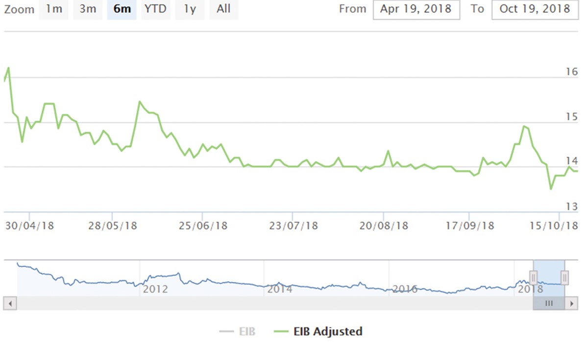 Tại ngày 17/10, giá cổ phiếu EIB trên thị trường được giao dịch dưới mốc 14.000 đồng/cổ phiếu, thấp hơn mức giá khởi điểm đưa ra, nên không hấp dẫn nhà đầu tư. Từ đó đến nay, EIB vẫn trong xu hướng giảm.