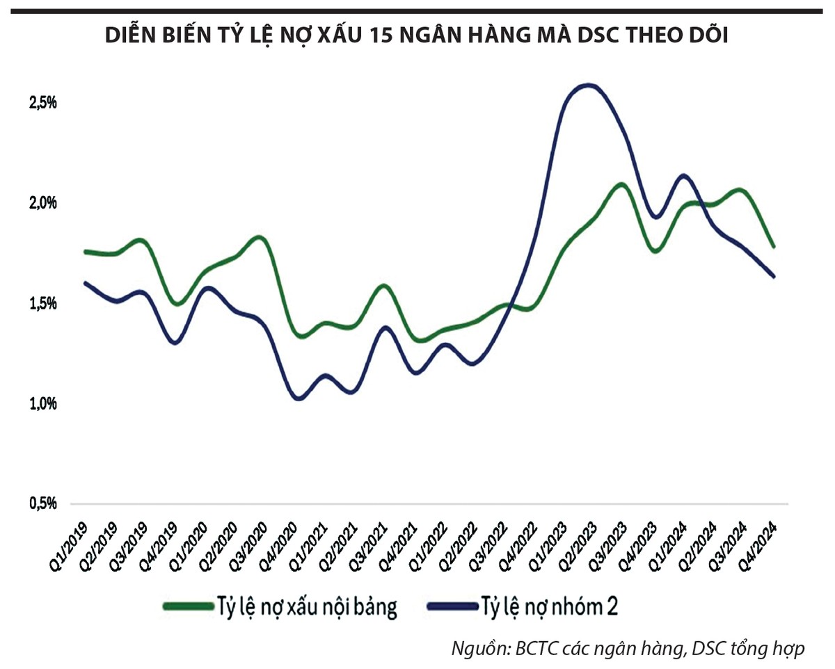 Về nhóm ngân hàng, tỷ lệ nợ xấu trung bình các ngân hàng mà DSC theo dõi (bao gồm 15 ngân hàng niêm yết, tương đương 92% vốn hóa ngành) tiếp diễn xu hướng tăng kể từ quý I/2024. Chúng tôi kỳ vọng, tỷ lệ nợ xấu đã tạo đỉnh và sẽ cải thiện trong năm 2025 nhờ 5 yếu tố sau. Một là, tốc độ hình thành nợ xấu đã chậm lại đáng kể trong quý IV/2024. Hai là, tỷ lệ nợ nhóm 2 và lãi dự thu tiếp tục xu hướng giảm.
