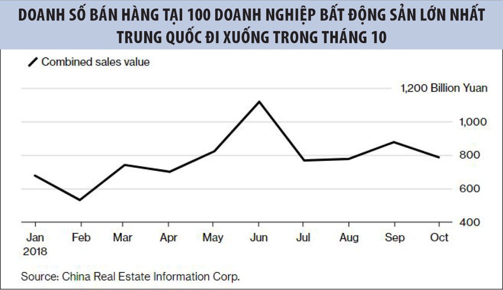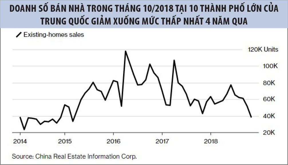 Một trong những dấu hiệu cho thấy thị trường bất động sản Trung Quốc hạ nhiệt là việc doanh số bán nhà hiện hữu, vốn đang bị kiểm soát chặt chẽ bởi các quy định của chính quyền, trong tháng 10/2018 đã rơi xuống mức thấp nhất 4 năm qua tại 10 thành phố được China Real Estate Information Corp (CRIC) theo dõi.