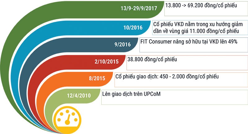 Tuy nhiên, phải đến tháng 9/2016, FIT Consumer mới nâng được sở hữu tại VKD lên 49%. Đây cũng là năm mà VKD quyết định tăng vốn điều lệ lên 120 tỷ đồng, gấp 5,6 lần vốn cũ, thông qua việc chào bán 9,84 triệu cổ phần cho cổ đông hiện hữu với giá 10.000 đồng/cổ phiếu, tỷ lệ 100:456. Từ tháng 10/2016, cổ phiếu VKD nằm trong xu hướng giảm dần về vùng giá 11.000 đồng/cổ phiếu.