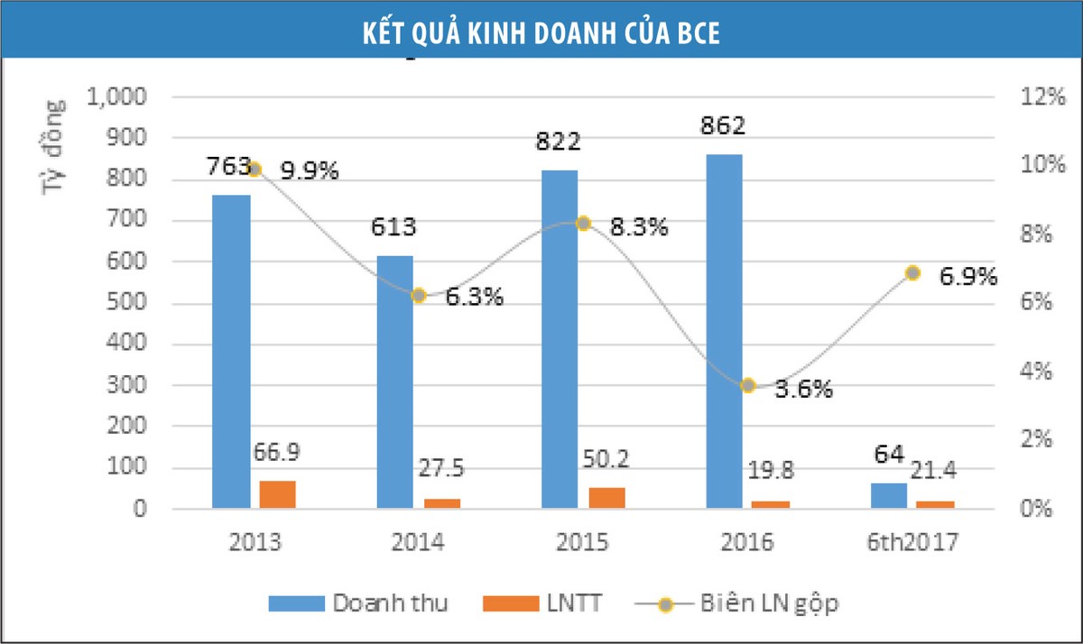 6 tháng đầu năm 2017, BCE đạt 64,2 tỷ đồng doanh thu, giảm 83%; lợi nhuận gộp 4,4 tỷ đồng, giảm 77% so với cùng kỳ năm 2016. Trong khi đó, các loại chi phí bán hàng, quản lý doanh nghiệp và chi phí tài chính đều tăng, khiến lợi nhuận thuần từ hoạt động kinh doanh lỗ hơn 3,8 tỷ (cùng kỳ lãi 13 tỷ đồng). Nếu không có “cứu cánh” từ lợi nhuận khác là 25,2 tỷ đồng, chủ yếu từ hoàn nhập bảo hành của công trình xây dựng Nhà xưởng Phú Đỉnh (24,3 tỷ đồng), BCE khó tránh khỏi thua lỗ (lợi nhuận 6 tháng đầu năm đạt 16,8 tỷ đồng).