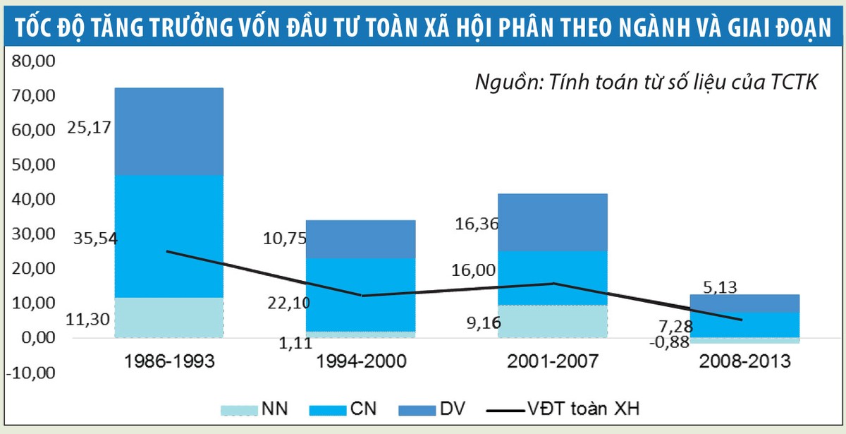Nguồn vốn đầu tư cho nông nghiệp chiếm tỷ trọng thấp, lại phân bổ không hợp lý, quản lý chưa hiệu quả là một trong những nguyên nhân ảnh hưởng trực tiếp tới tăng trưởng của ngành. Vốn ngân sách theo Bộ Nông nghiệp Phát triển nông thôn, tập trung nhiều nhất cho thủy lợi (75,6%), chủ yếu là các công trình tưới tiêu lớn cho vùng trọng điểm lúa ở hai vùng đồng bằng chính.