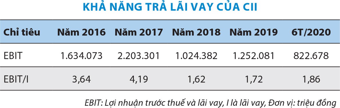 Áp dụng công thức EBIT/I (Lợi nhuận trước thuế và trước lãi vay/lãi vay) để đánh giá khả năng trả lãi vay (chưa tính tới khả năng trả gốc) thì tại thời điểm này, tỷ lệ EBIT/I của CII có dấu hiệu giảm, năm 2016 là 3,64 lần, 6 tháng đầu năm 2020 là 1,86 lần.