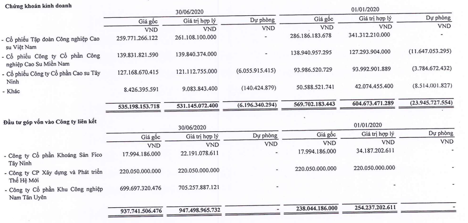 Tính tới 30/6/2020, doanh nghiệp đang sở hữu 531,1 tỷ đồng chứng khoán kinh doanh, đã trích lập dự phòng gần 6,2 tỷ đồng. Cụ thể, đầu tư vào cổ phiếu Tập đoàn Công nghiệp Cao su Việt Nam (GVR) với giá trị 261,1 tỷ đồng; đầu tư vào cổ phiếu CTCP Công nghiệp Cao Su Miền Nam (CSM) là 139,8 tỷ đồng; đầu tư vào cổ phiếu CTCP Cao su Tây Ninh (TRC) với giá trị là 121,1 tỷ đồng, đã trích lập dự phòng gần 6,1 tỷ đồng.