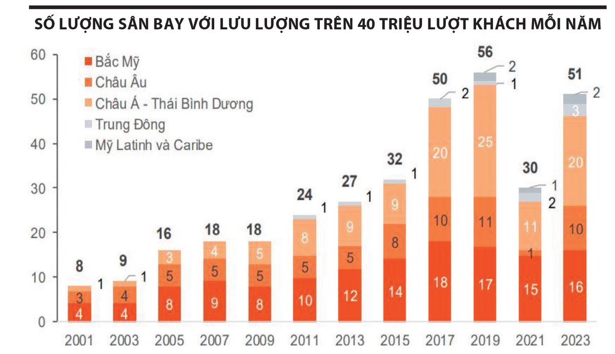 Những năm gần đây, ngành hàng không toàn cầu chứng kiến đà tăng trưởng mạnh mẽ, kéo theo làn sóng xây dựng và mở rộng các sân bay quy mô lớn. Nếu như năm 2001, trên thế giới chỉ có 8 sân bay đón hơn 40 triệu lượt khách/năm, thì đến năm 2019, con số này đã tăng lên 56. Cùng với đó, nhiều “siêu sân bay” có công suất thiết kế trên 100 triệu WLU/năm (1 WLU tương đương 1 hành khách hoặc 100 kg hàng hóa đi/đến) đang được triển khai.