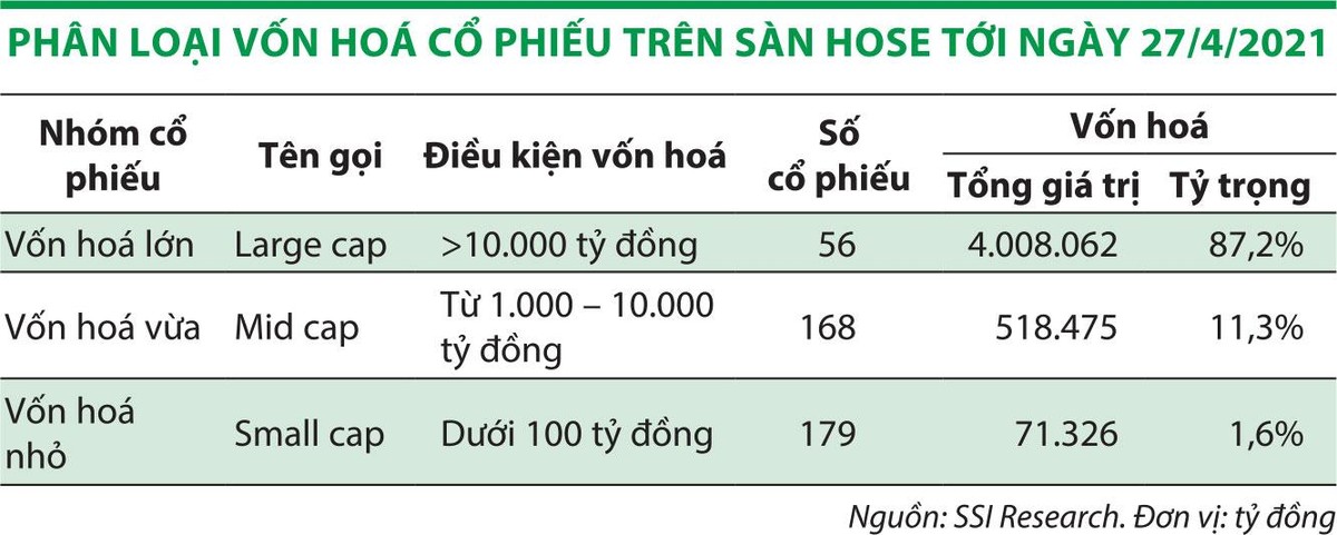 Theo số liệu của SSI Research tính tới ngày 27/4/2021, trên sàn HOSE có 56 mã cổ phiếu vốn hoá trên 10.000 tỷ đồng, chiếm 13,9% tổng số cổ phiếu niêm yết trên Sở. Vốn hoá nhóm cổ phiếu này tổng cộng là 4.008.062 tỷ đồng và chiếm 87,2% tổng vốn hoá thị trường. Nhóm cổ phiếu mid cap có tổng cộng 168 mã, chiếm 41,7% tổng số cổ phiếu đang niêm yết trên HOSE, với vốn hoá đạt 518.475 tỷ đồng và chiếm 11,3% tổng vốn hoá thị trường. Nhóm cổ phiếu small cap có 179 mã, chiếm 44,4% tổng số cổ phiếu niêm yết trên HOSE với vốn hoá là 71.326 tỷ đồng và chiếm 1,6% tổng vốn hoá của thị trường.