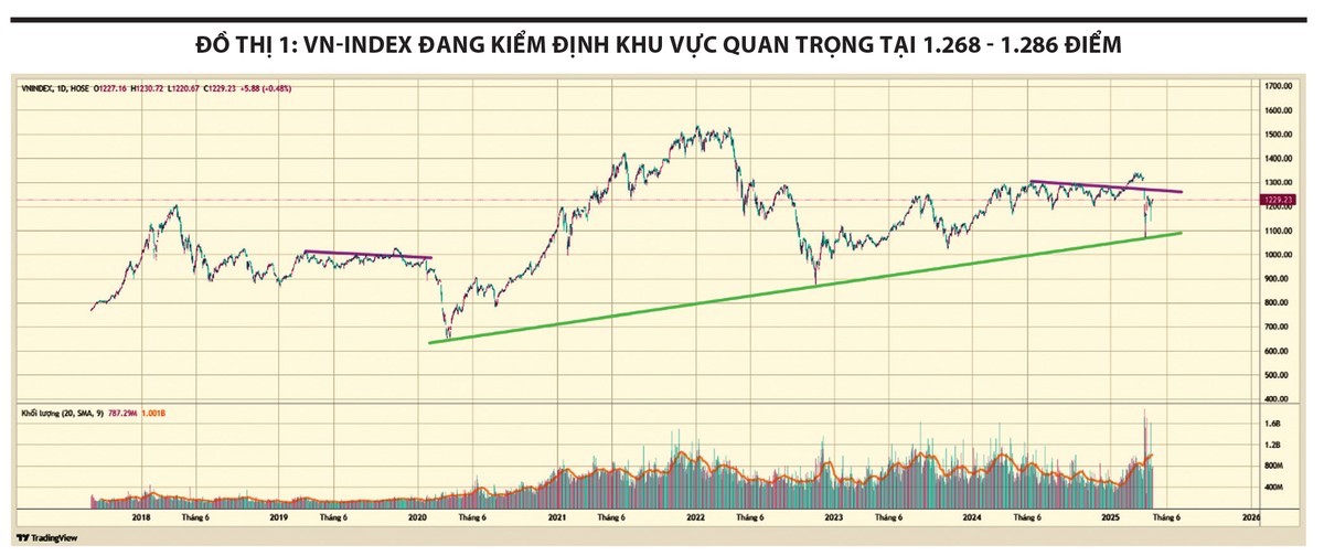 Cơ sở cho tính thanh khoản tích cực này có thể đến từ 2 hướng chính. Một là, giá trung bình tích lũy trong năm 2024 và nhiều năm trước của thị trường ở mức tương đương VN-Index 1.250 điểm. Đợt giảm giá mang lại “khu vực khuyến mại” đột biến, khiến nhà đầu tư dài hạn tin tưởng mức định giá rẻ xấp xỉ đường kẻ màu tím dài hạn (xem đồ thị 1) và cơ hội mua được hàng với khối lượng lớn. Hai là, định hướng tăng trưởng kinh tế dài hạn ở mức 2 con số và kết quả khả quan quý I/2025 cũng lợi nhuận nhiều doanh nghiệp đang ở mức rất tốt. Sau thông tin áp thuế của Mỹ, chúng ta nhận thấy rõ nỗ lực từ Chính phủ trong việc chủ động tiếp cận thương thảo về chính sách thuế và vẫn khẳng định mục tiêu tăng trưởng GDP đưa ra từ đầu năm nay.